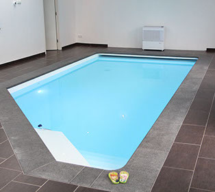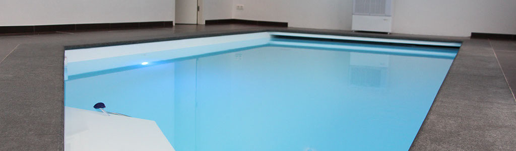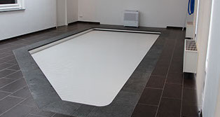 Ook is hier de afdekking geheel weggewerkt en geintregeerd in het zwembad en zien men alleen de “gleuf” waar de afdekking naar buiten komt. Met een druk op de knop, die zich in de zwembadhal bevind, gaat de afdekking open en dicht. In het zwembad bevind zich een grote luxe inlooptrap die met een antislip folie bekleed is. In de trap is een tegenstroom installatie gemonteerd die wordt bediend met een drukknop in het