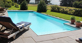 Dit prive buitenbad heeft een afmeting van 4 x 10 met grote luxe inlooptrap en een schacht achter het zwembad waar de lamellenafdekking gemonteerd is. De kleur van de folie is licht blauw met een natuur stenen rand afwerking. Over de schacht is hout gemonteerd om een natuurlijke uitstraling te geven. Het zwembad ligt erg landelijk met veel groen erom heen. Omdat dit zwembad zo dicht bij al het groen is aangelegd moet onderhoud niet worden vergeten.