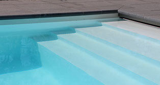Het zwembad afdekking gaat door middel van een lamellenafdekking die zich achter het zwembad in een schacht bevind. Het granieten terras loopt over een r.v.s. framewerk door over de schacht en zo de lamellenafdekking niet zichtbaar is in open toestand.
