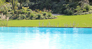 Deze bak is bekleed met een natuursteen zodat het optisch een geheel is met de randafwerking. Door gebruik te maken van een overloop moet er voldoende water over de rand gaan en er is gekozen voor een zwembadpomp die 40 m3 per uur pompt.