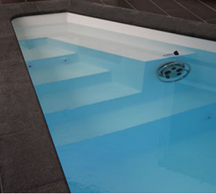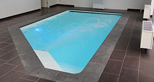 Ook is hier de afdekking geheel weggewerkt en geintregeerd in het zwembad en zien men alleen de “gleuf” waar de afdekking naar buiten komt. Met een druk op de knop, die zich in de zwembadhal bevind, gaat de afdekking open en dicht. In het zwembad bevind zich een grote luxe inlooptrap die met een antislip folie bekleed is. In de trap is een tegenstroom installatie gemonteerd die wordt bediend met een drukknop in het