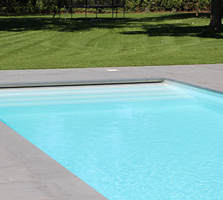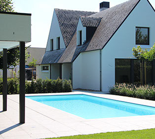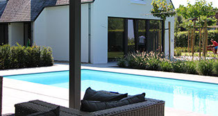 Het zwembad afdekking gaat door middel van een lamellenafdekking die zich achter het zwembad in een schacht bevind. Het granieten terras loopt over een r.v.s. framewerk door over de schacht en zo de lamellenafdekking niet zichtbaar is in open toestand.
