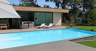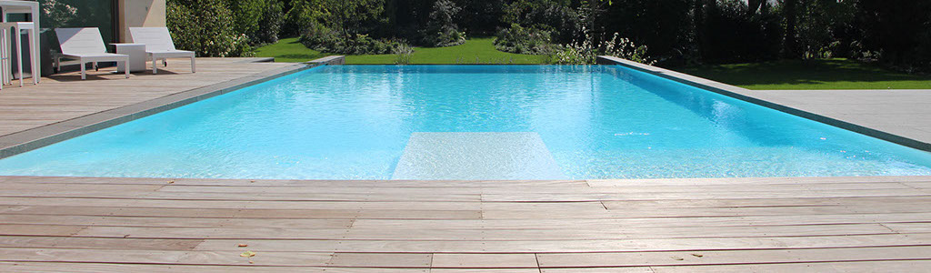 Deze afdekking is een Polycarbonaat solar lamellendek. Aan de andere kopse kant van het zwembad gaat het terras naar beneden en hebben we een
