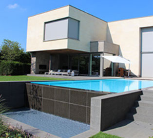 Deze bak is bekleed met een natuursteen zodat het optisch een geheel is met de randafwerking. Door gebruik te maken van een overloop moet er voldoende water over de rand gaan en er is gekozen voor een zwembadpomp die 40 m3 per uur pompt.